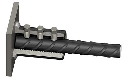 Los acopladores MBT no necesitan preparación del extremo de la barra para realizar roscas ni rotación de la barra para efectuar la instalación. Las barras se sujetan en el interior del acoplador por medio de dos caballetes acanalados. A medida que los pernos de cerradura son apretados hasta un par de apriete predeterminado, quedan incrustados en la barra. Al mismo tiempo, los caballetes acanalados inmovilizan la barra y la estructura del acoplador. La instalación se habrá completado cuando las cabezas de todos los pernos queden fijas. Los pernos de cerradura de tamaños entre 10 y 20 mm se pueden apretar con una llave de trinquete. Para tamaños más grandes se recomienda el uso de un aprietatuercas mecánico. No se deben usar herramientas de impacto. Los acopladores MBT se pueden utilizar para unir barras con medidas imperiales o barras de refuerzo aplanadas o deformadas.