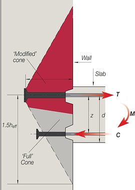 Dai test effettuati per identificare le proprietà di trazione diretta dei sistemi di ancoraggio KSN, Ancon riscontra un potenziale incremento nelle prestazioni degli ancoraggi quando la sezione di compressione del momento torcente rientra nel cono di trazione.