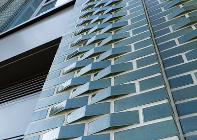 This development showcases distinctive and visually striking brickwork with a combination of brick types and bonding patterns. The multi-storey residential building is clad in brickwork up to the 13th floor with rainscreen cladding on the final two storeys.